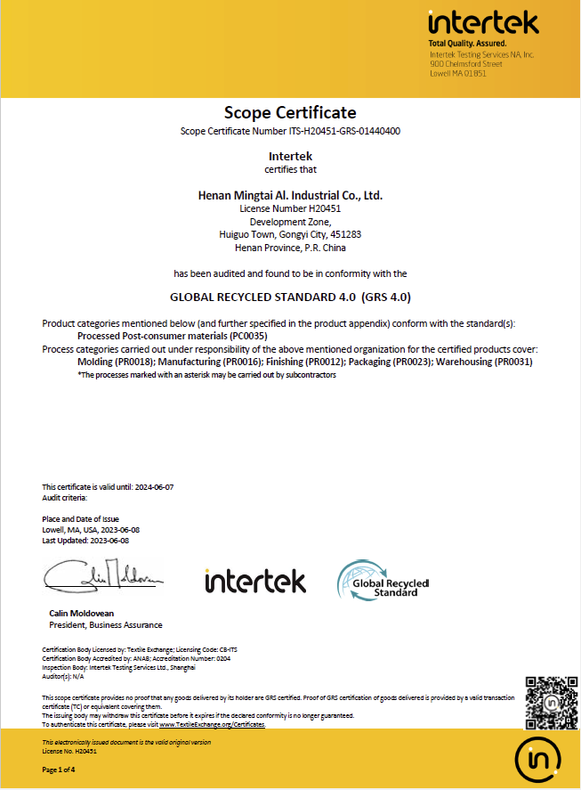近日,河南明泰鋁業(yè)股份有限公司順利通過“GRS全球回收標(biāo)準(zhǔn)”認(rèn)證審核,取得GRS4.0標(biāo)準(zhǔn)證書。