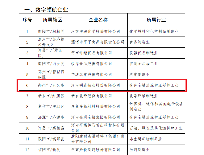 近日,河南省工業(yè)和信息化廳對(duì)擬入選2024年度河南省數(shù)字領(lǐng)航企業(yè)、中小企業(yè)數(shù)字化轉(zhuǎn)型標(biāo)桿名單進(jìn)行公示,河南明泰鋁業(yè)股份有限公司成功入選2024年河南省數(shù)字領(lǐng)航企業(yè),子公司河南明晟新材料科技有限公司、河南泰鴻新材料有限公司入選中小企業(yè)數(shù)字化轉(zhuǎn)型標(biāo)桿名單,公司數(shù)字化轉(zhuǎn)型成果再獲權(quán)威認(rèn)可。